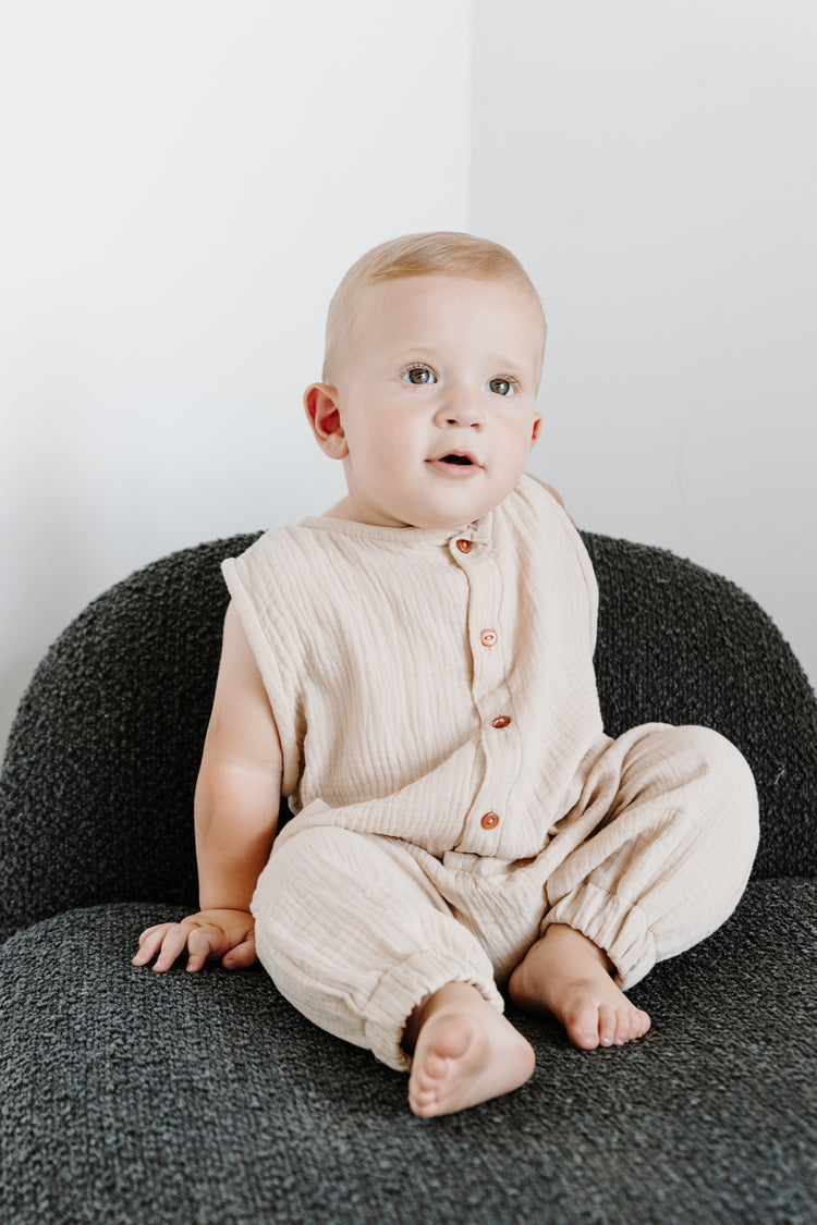 The Cub Comfort Jumpsuit is the ultimate blend of ease, comfort, and timeless style. Designed with active little ones in mind, this sleeveless jumpsuit allows for unrestricted movement, while the full-length design keeps them cozy and covered.